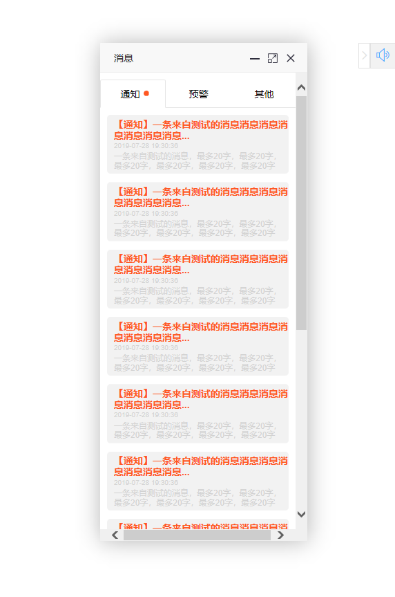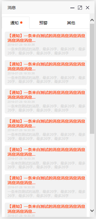 "content": [{"title": "【通知】一条来自测试的消息消息消息消息消息消息消息消息消息", "content": "一条来自测试的消息,最多20字,最多20字,最多20字,最多20字,最多20字,最多20字", "date": "2019-07-28 19:30:36", "url": "http://www.baidu.com"},