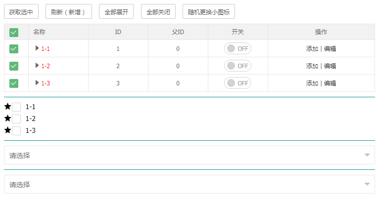 树、树表展开关闭及一些常用功能。加入了状态记忆、渲染、刷新、更换图标、列渲染等配置。并设置一些监听、获取参数快捷操作。并在示例中扩展了下拉选择(单选、多选)功能。